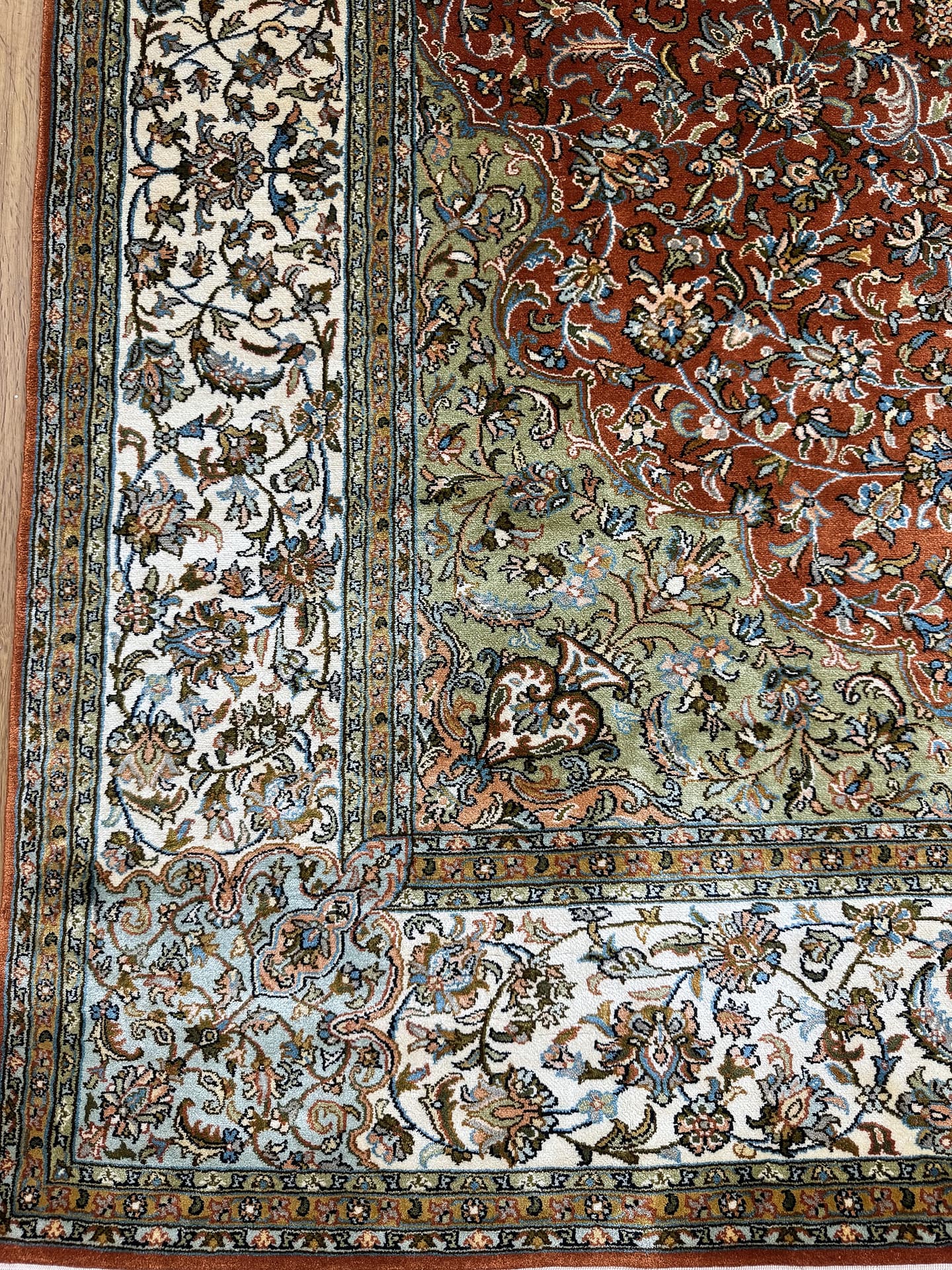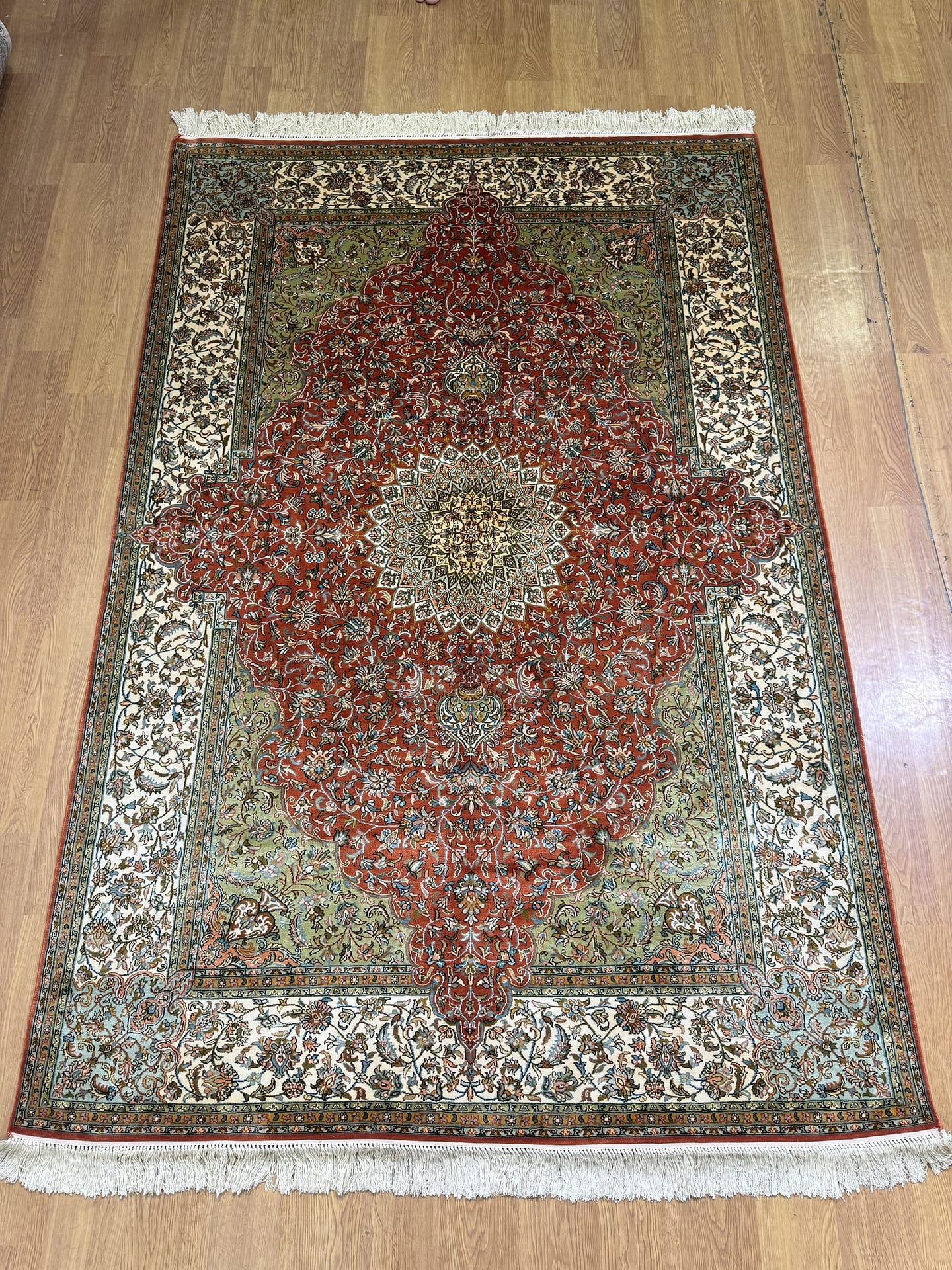 1. Material: The primary material used in a silk carpet is silk, often obtained from silkworms. The use of silk gives the carpet a smooth, soft texture and a natural sheen that is highly desirable.