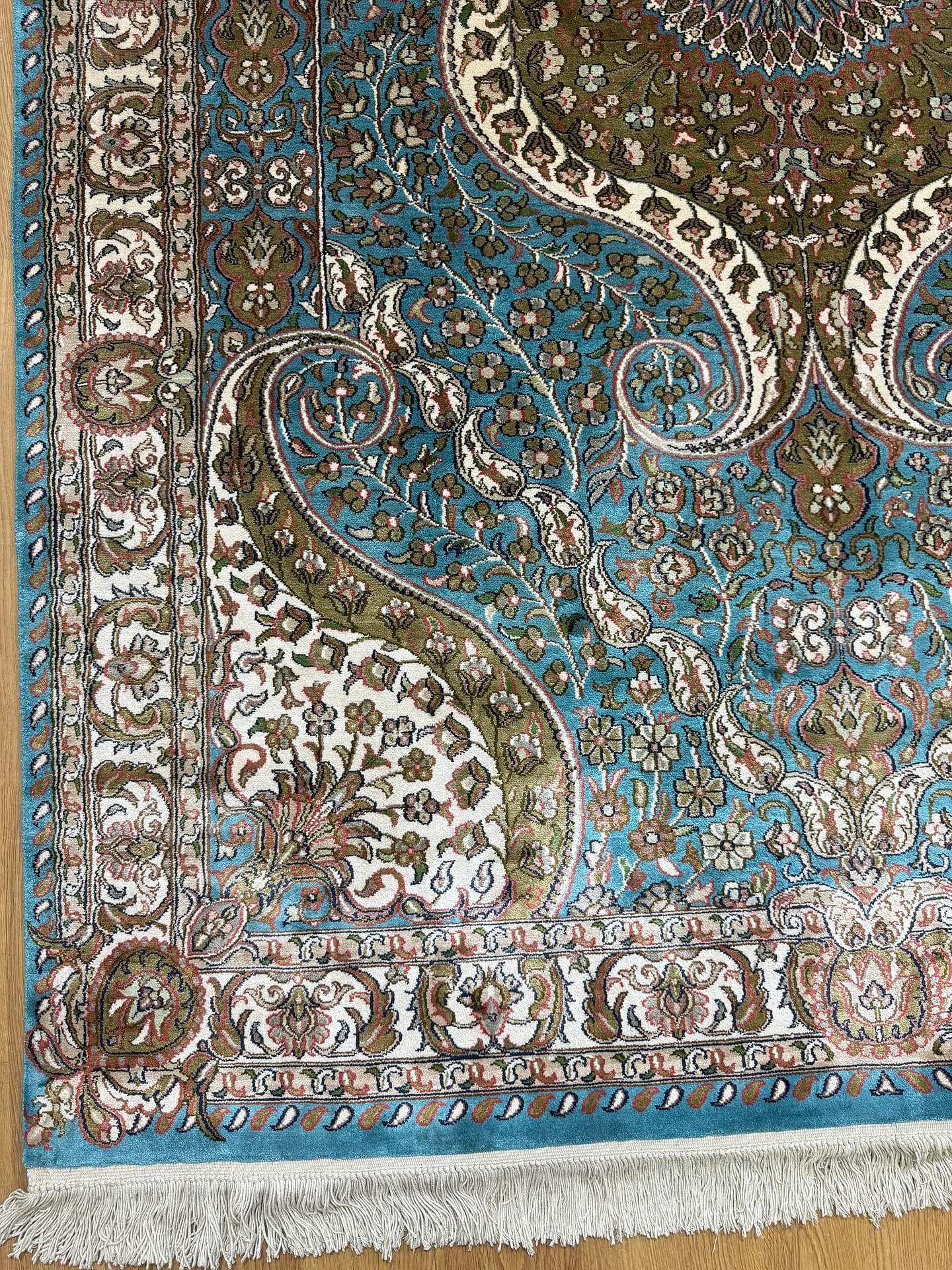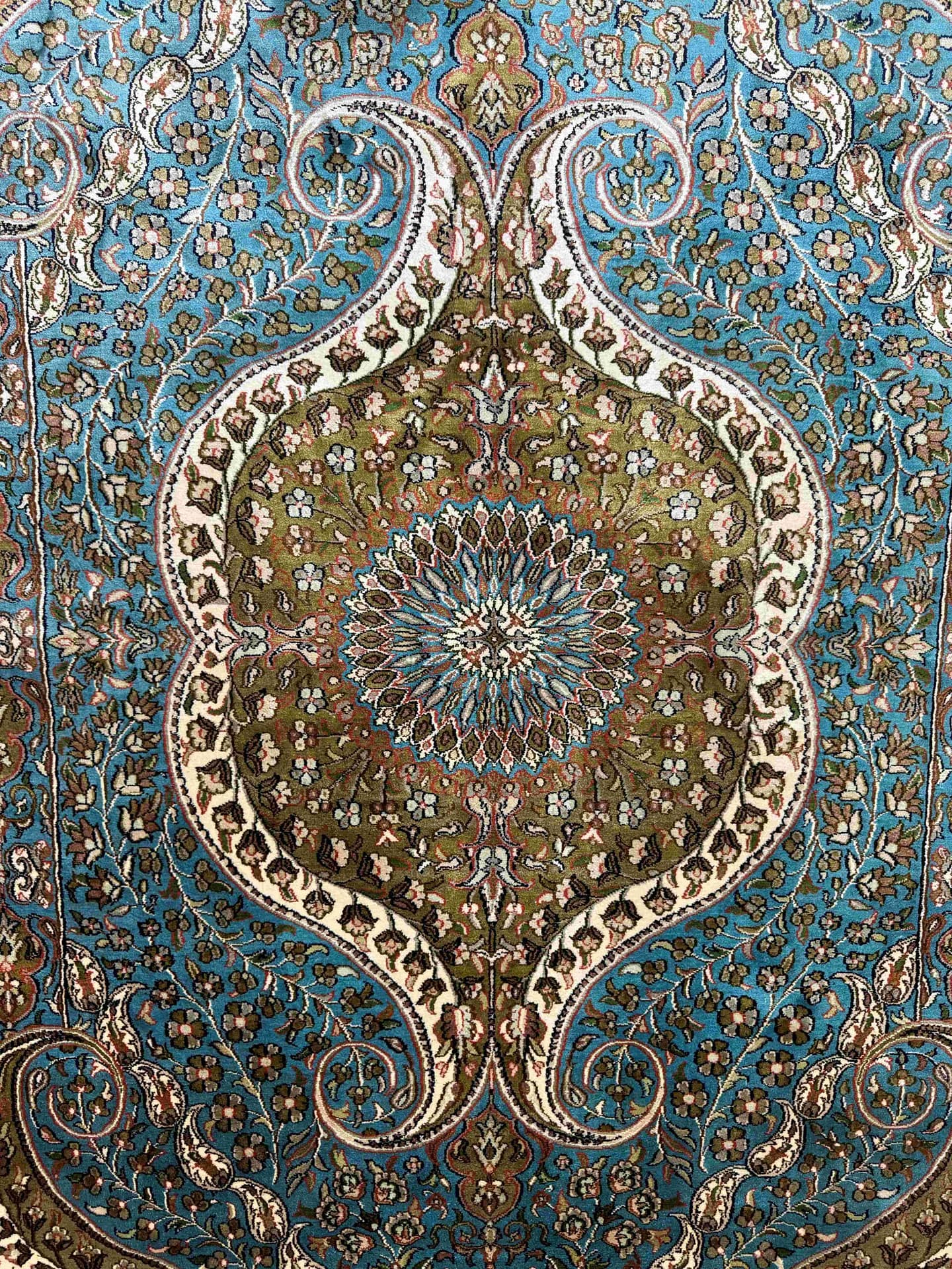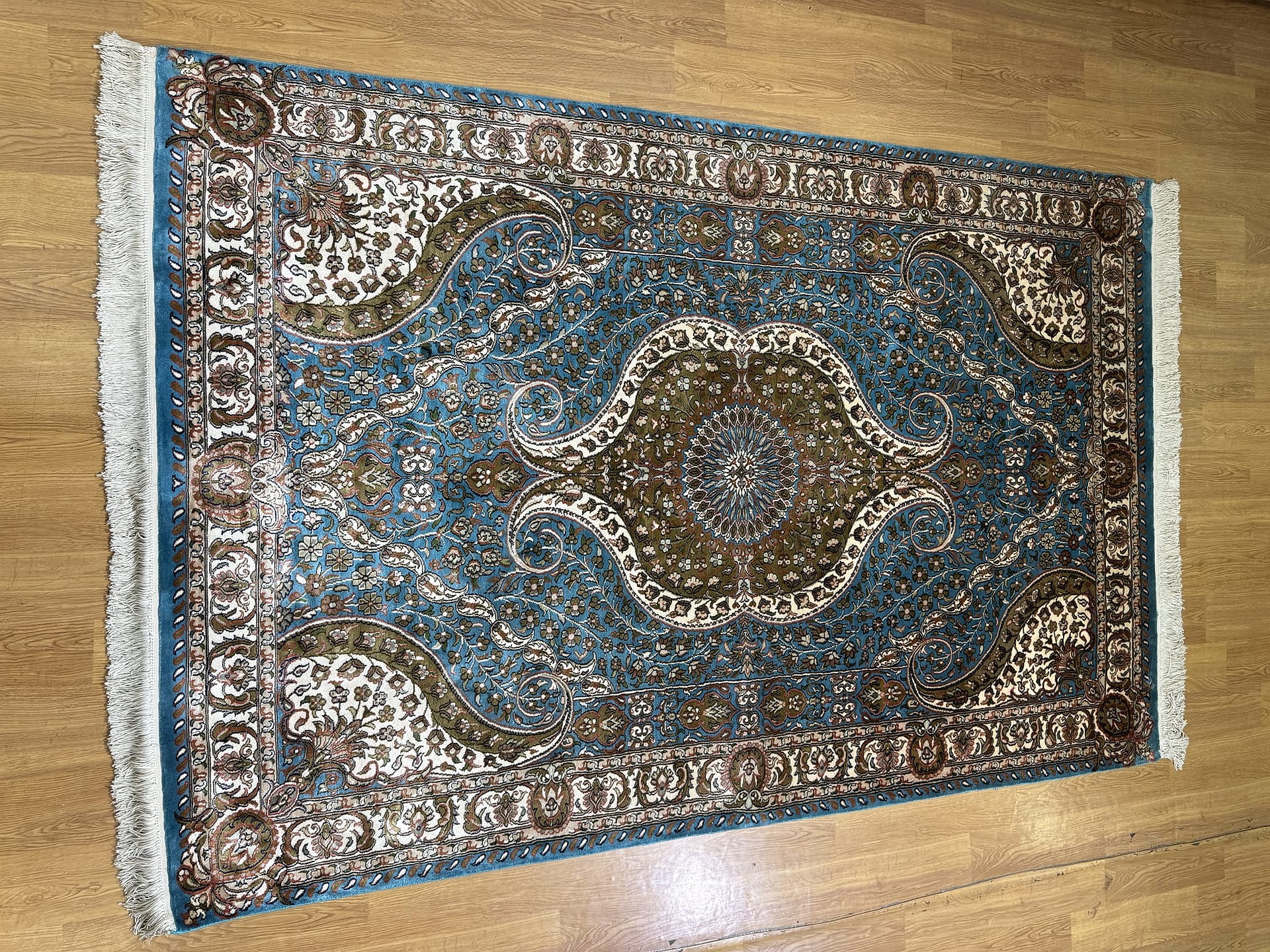 1. Material: The primary material used in a silk carpet is silk, often obtained from silkworms. The use of silk gives the carpet a smooth, soft texture and a natural sheen that is highly desirable.